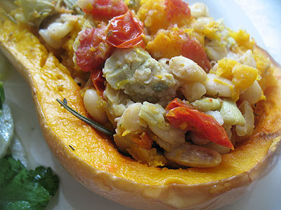Meanwhile, combine the beans, artichokes, tomatoes, wine, basil, oregano, salt and pepper in a small oven-safe casserole dish. Drizzle with olive oil. After the squash has been roasting for 10-15 minutes, place the casserole dish uncovered in the oven beside the squash and bake for 20-30 minutes or until the liquid has evaporated and the beans are still moist but not dry. Remove from oven and set aside until the squash is finished.